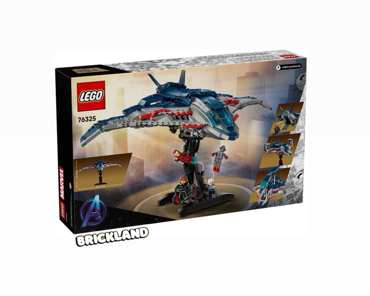 דגם הקווין-ג'ט לבנייה מגיע עם 5 דמויות מיניפיג: בלאק וידו עם האופנוע שלה, איירון מן, קוויקסילבר, אולטימייט אולטרון, והוקאיי עם קשת וחצים. ניתן להציב את הדמויות במספר נקודות על המטוס. הקווין-ג'ט כולל תא טייס נפתח, שני יורים בחזית, מקום אחסון לנשק של בלאק וידו וקשת של הוקאיי, ודלת אחורית שנפתחת כדי לאפשר לאופנוע להיכנס ולצאת. הסט כולל גם מעמד מסתובב שניתן להסרה, המאפשר להציג את המטוס האיקוני בזווית של 360 מעלות.
